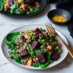 This colorful beet salad with carrot, quinoa, and spinach is a vibrant and nutritious dish perfect for a light lunch or side. It combines earthy beets and carrots with protein-rich quinoa and edamame, fresh spinach, and creamy avocado, all tossed in a tangy, slightly sweet dressing made from apple cider vinegar, lime juice, and honey or maple syrup. Toasted slivered almonds or pepitas add a delightful crunch, while fresh parsley brightens the flavors. This salad is wholesome, filling, gluten-free, and perfect for anyone seeking a healthy, plant-based meal.