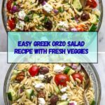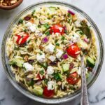 A refreshing and vibrant Greek Orzo Salad packed with fresh vegetables, chickpeas, and a tangy homemade dressing made with olive oil, garlic, and herbs. This easy-to-make salad is perfect as a light meal or side dish, offering Mediterranean flavors that come together beautifully after resting to marry the ingredients.